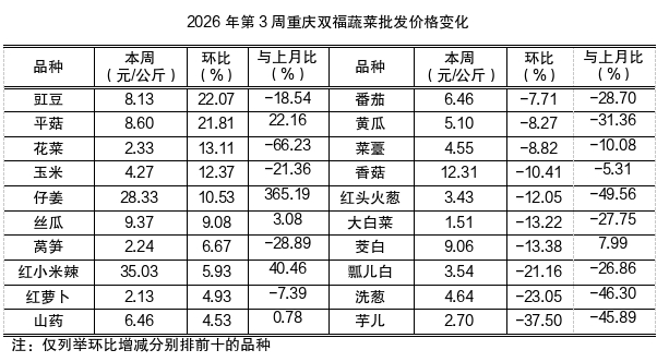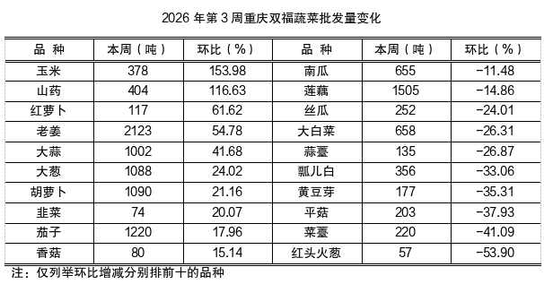 第3周蔬菜批发量表现28增13减1平稳,总批发上市量37562.02吨,环比小幅增加5.67%,同比减少10.79%。其中,大宗蔬菜批发品种(周批发总量超过700吨)22个,批发量31514.42吨,环比小幅增加5.21%,同比明显减少15.87%,占总批发量的83.90%。大宗品种排名前10的品种:土豆4029吨、青椒2651吨、白萝卜2371吨、老姜2123吨、番茄2099吨、莲花白1973吨、莴笋1845吨、莲藕1505吨、洗葱1422吨、黄瓜1227吨。(增减幅前十位品种见下表)