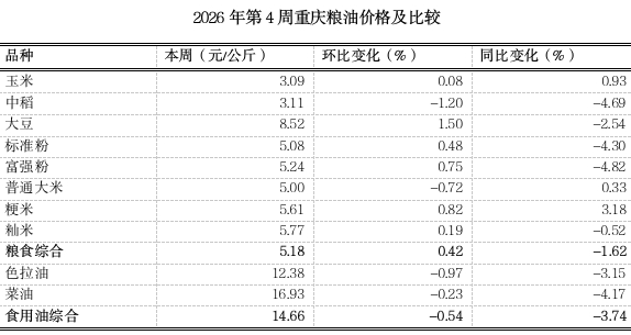 根据市农信中心对我市各区县农贸市场10个主要粮油品种监测,第4周(2026.1.19~2026.1.25)重庆粮食均价5.18元、食用油均价14.66元(公斤价,以下同),环比分别上浮0.42%、下滑0.54%,均表现平稳,同比分别下跌1.62%、3.74%。总体来看,国内粮油生产供应稳固,供给总体宽松。随着春节临近市场消费需求逐渐回升,市内粮油市场各品种价格将以稳为主。分品种看1跌9平稳。其中,中稻收购价环比稳中略跌1.20%。其余粮油品种延续平稳态势。
