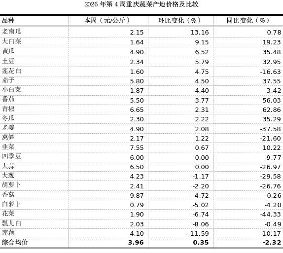 根据市农信中心对我市各区县农贸市场22个地产蔬菜品种监测,第4周重庆市蔬菜产地均价3.96元,环比上浮0.35%、表现平稳,同比略跌2.32%。1月,地产蔬菜供应以芥菜类、根菜类、甘蓝类、白菜类、绿叶菜类等为主。冬季地产蔬菜品种丰富、储备充足,蔬菜消费处于季节性淡季,但临近春节及寒假,市场消费基本稳定,蔬菜价格仍以稳为主。其中,老南瓜环比上涨13.16%;莲藕环比下跌11.59%。其余蔬菜价格波动幅度较小。