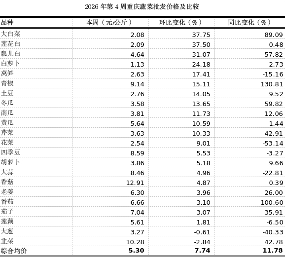 第4周重庆市双福国际农贸城蔬菜批发上市量(去粤菜)3.75万吨,环比下滑0.17%,表现平稳;同比大幅减少20.72%。22个蔬菜监测品种批发均价5.30元,环比上涨7.74%;同比明显上涨11.78%。本周全国多地气温下降,加上霜冻、雨雪天气,蔬菜运输、储存受到影响,大部分品种批发价格出现明显上涨。其中,大白菜、莲花白、瓢儿白、白萝卜环比分别上涨37.75%、37.50%、31.07%、24.18%;韭菜略跌2.84%。其余蔬菜价格波动幅度较小。
