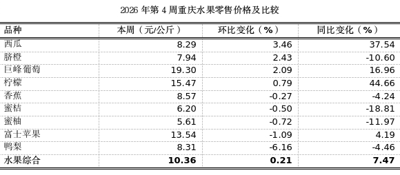 第4周我市各区县农贸市场9个大宗、时令水果监测品种总体零售均价10.36元,环比上浮0.21%、表现平稳,同比上涨7.47%。本周全国多地气温骤降,雨雪、霜冻天气导致部分水果田间管理、仓储冷链、物流运输等成本增加。春节假期及学生寒假临近,餐饮备货、家庭采购略有增加,市场消费需求稳定,各品类水果价格波动不大。其中,西瓜、脐橙、巨峰葡萄环比分别略涨3.46%、2.43%、2.09%;鸭梨下跌6.16%。其余水果价格基本平稳。