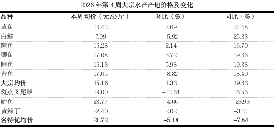 据市农业农村委监测,第4周重庆大宗水产产地均价15.16元/公斤,环比稳中略涨1.33%,同比上涨19.63%。名特优水产均价21.72元/公斤,环比下跌5.18%,同比下跌7.84%。年前市场处于集中出鱼高峰,存塘量持续消耗,年后市场消费热度回落,家庭采购与餐饮需求同步收缩,市场流通节奏明显放缓,本地水产价格整体小幅波动。