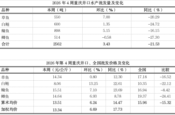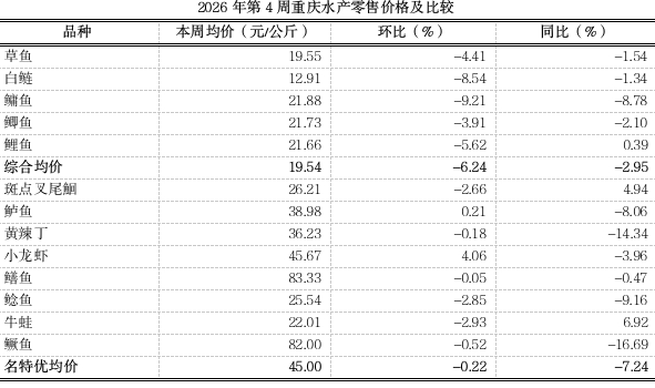 据市农业农村委监测,第4周重庆大宗水产零售均价19.54元/公斤,环比下跌6.24%,同比小幅下跌2.95%。名特优水产均价45.00元/公斤,环比下滑0.22%、表现平稳,同比下跌7.24%。