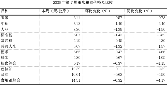 根据市农信中心对我市各区县农贸市场10个主要粮油品种监测,第7周(2026.2.9~2026.2.15)重庆粮食均价5.17元、食用油均价14.51元(公斤价,以下同),环比分别下滑0.37%、0.32%,均表现平稳;同比分别下跌1.15%、4.17%。总体来看,国内粮油生产供应稳固,供给总体宽松,春节期间市场消费需求回升,市内粮油市场各品种价格以稳为主。分品种看1涨3跌7平稳。其中,中稻收购价略涨1.49%,大豆、标准粉、普通大米零售价分别略跌1.39%、1.43%、1.32%。其余粮油品种延续平稳态势。