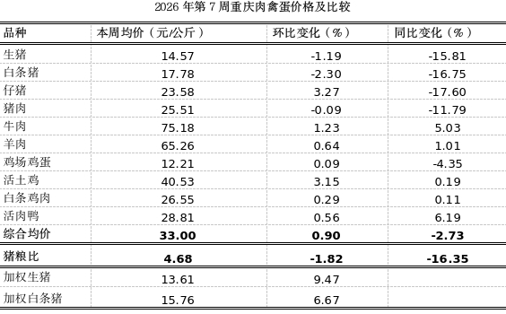 据市农业信息中心对我市各区县农贸市场10个主要肉禽蛋品种监测,第7周重庆市肉禽蛋均价33.00元,环比平稳,涨0.90%,同比小幅下跌2.73%。本周重庆猪肉市场呈现供需双弱、价格小幅下行的态势。供应端,春节假期屠宰场开工率低、出栏节奏放缓。需求端,虽有春节备货支撑,但整体需求不及预期,消费提振力度有限,未能扭转价格下行趋势。本周仔猪零售价上涨3.27%,生猪收购价、白条猪批发价、猪肉零售价分别下跌1.19%、2.30%、0.09%,猪粮比4.68:1(低于盈亏平衡点6:1),环比稳中略跌1.82%,同比下跌16.35%。