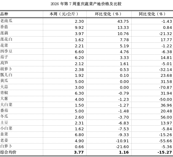 根据市农信中心对我市各区县农贸市场22个地产蔬菜品种监测,第7周重庆市蔬菜产地均价3.77元,环比上浮1.16%,表现平稳,7涨6跌9平稳;同比明显下跌15.27%。2月,地产蔬菜供应以青菜头、萝卜、莲白、大白菜等冬季菜为主,产地价格总体保持稳定。受节假日效应影响,田间劳作减少,人工成本上涨,部分品种价格波动明显。其中,老南瓜、香菇、莲藕环比分别上涨43.75%、13.33%、10.76%;白萝卜、老姜环比分别下跌21.60%、10.91%。其余蔬菜价格波动幅度较小。