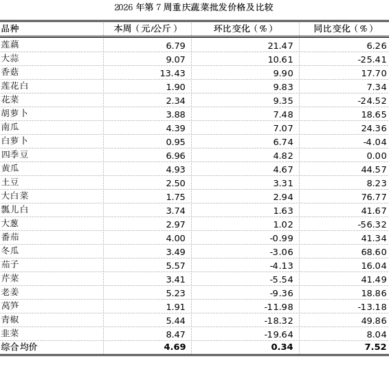 第7周重庆市双福国际农贸城蔬菜批发上市量(去粤菜)4.45万吨,环比明显增加10.62%;同比大幅增加23.53%。22个蔬菜监测品种批发均价4.69元,环比上浮0.34%,表现平稳,12涨7跌3平稳;同比上涨7.52%。春节前夕,批发市场迎来交易小高峰,交易量连续两周增长,市场交易品种丰富,总体价格以平稳为主。其中,莲藕、大蒜环比分别上涨21.47%、10.61%;韭菜、青椒、莴笋环比分别下跌19.64%、18.32%、11.98%。其余蔬菜价格波动幅度较小。