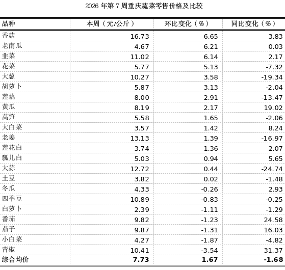 第7周重庆市各区县农贸市场22个蔬菜监测品种零售均价7.73元,环比上浮1.67%,表现平稳;同比下滑1.68%,表现平稳。分品类看8涨1跌13平稳。其中,香菇、老南瓜、韭菜、花菜环比分别上涨6.65%、6.21%、6.14%、5.13%;青椒环比下跌3.54%。其余蔬菜价格波动较小。