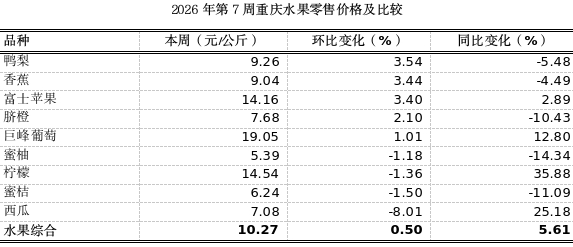 第7周我市各区县农贸市场9个大宗、时令水果监测品种总体零售均价10.27元,环比上浮0.50%、表现平稳,同比小幅上涨5.61%。春节前一周,水果市场供需两旺,本地锦橙、脐橙、血橙等中晚熟柑橘供应充足,外地草莓、车厘子、蓝莓、青枣等春季水果集中上市,节前商家备货、家庭采购持续稳定增加,水果总体价格保持平稳态势。分品种看,4涨1跌4平稳。其中,鸭梨、香蕉、富士苹果、脐橙环比略涨3.54%、3.44%、3.40%、2.10%;西瓜环比跌8.01%。其余品种价格表现稳定。