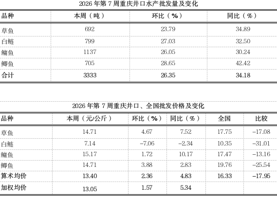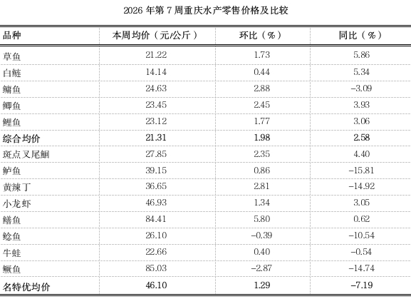 据市农业农村委监测,第7周重庆大宗水产产地均价15.54元,环比稳中略涨1.16%,同比上涨14.26%。名特优水产均价23.18元,环比上浮0.39%、表现平稳,同比下跌3.42%。临近春节假期,市场消费采购需求增加,前期市场处于集中出鱼高峰,供应充足,市场处于“供需两旺”趋势,价格整体稳中略涨。