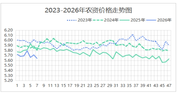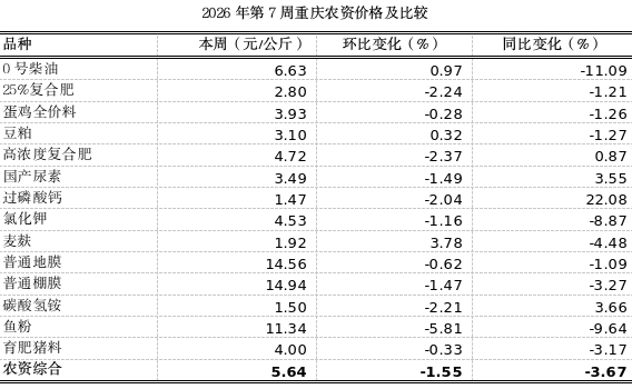 根据市农信中心对全市各区县农贸市场15种主要农资监测,第7周重庆农资总体均价5.64元,环比略跌1.55%,同比下跌3.67%。春节期间重庆温暖适宜,气温回升,中心城区12-24度。传统节日期间,农事活动较少。本周化肥价格全线下跌,其中25%复合肥、高浓度复合肥、国产尿素、过磷酸钙、氯化钾、碳酸氢铵分别跌2.24%、2.37%、1.49%、2.04%、1.16%、2.21%。2月是柑橘萌芽前修剪和施用有机肥的最后窗口期,宜以轻剪为主,避免重剪削弱树势;已采收果园,清园后需立即施用有机肥或腐熟农家肥,配合速效化学肥料助力树势恢复。本周普通地膜下滑0.62%、表现平稳,普通棚膜下跌1.47%。饲料价格总体略跌。其中,麦麸上涨3.78%,鱼粉下跌5.81%,豆粕、育肥猪饲料价格平稳。晴暖天气宜把猪赶到室外晒太阳,加强运动,提高猪对寒冷天气的抵抗力。蛋鸡全价料下滑0.28%、表现平稳。0号柴油价格上浮0.97%,价格连续两周上行。