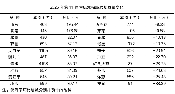 第11周蔬菜批发量表现21增14减4平稳,总批发上市量40552.16吨,环比增加6.52%,同比略跌2.47%。其中,大宗蔬菜批发品种(周批发总量超过700吨)22个,批发量34327.30吨,环比上浮0.51%、表现平稳,同比小幅减少5.71%,占总批发量的84.65%。大宗品种排名前10的品种:青椒4193吨、土豆3667吨、番茄2908吨、莲藕2110吨、莲花白2103吨、白萝卜1957吨、莴笋1669吨、黄瓜1601吨、老姜1372吨、洗葱1221吨。(增减幅前十位品种见下表)