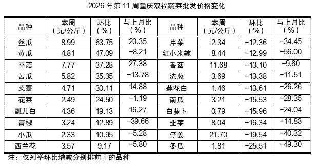第11周蔬菜批发价格环比18跌16涨5平稳,总体算术批发均价4.85元(为公斤价,以下同),环比上浮0.83%、表现平稳,同比下滑1.02%、表现平稳。总体加权批发均价3.81元,环比上浮0.70%、表现平稳,同比略跌3.08%。具体表现,环比跌幅较大的品种及价格变化:冬瓜1.81元,环比大幅下跌25.51%;仔姜、韭菜、白萝卜、南瓜、莲花白、洗葱、香菇、红小米辣、芹菜,环比分别明显下跌19.54%、16.34%、15.96%、15.53%、13.61%、13.38%、13.10%、12.99%、12.36%。环比涨幅较大的品种及价格变化:丝瓜8.99元、黄瓜4.81元、平菇7.77元、苦瓜5.82元、菜薹4.71元,环比分别陡升63.75%、47.09%、37.28%、35.35%、30.11%;花菜2.49元,环比大幅上涨24.50%;瓢儿白、青椒、小瓜,环比分别明显上涨19.13%、12.89%、10.95%。(增减幅前十位品种见下表)