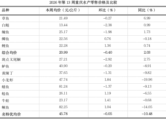 据市农业农村委监测,第13周重庆大宗水产零售均价20.99元/公斤,环比下滑0.40%、表现平稳,同比小幅上涨2.03%。名特优水产均价45.78元/公斤,环比下滑0.05%、表现平稳,同比下跌10.48%。