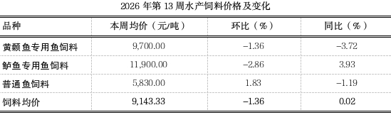 据市农业农村委监测,第13周水产饲料均价9143.33元/吨,环比下跌1.36%,同比上涨0.02%,其中黄颡鱼专用鱼饲料价格下跌1.36%,鲈鱼专用鱼饲料价格下跌2.86%,普通鱼饲料价格上涨1.83%。