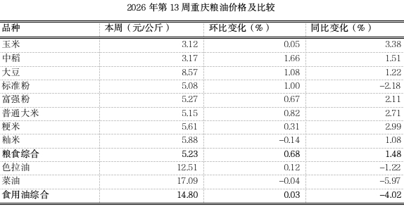 根据市农信中心对我市各区县农贸市场10个主要粮油品种监测,第13周(2026.3.23~2026.3.29)重庆粮食均价5.23元、食用油均价14.80元(公斤价,以下同),环比分别上浮0.68%、0.03%,表现平稳;同比分别略涨1.48%、下跌4.02%。总体来看,各地扎实推进春耕春管,为全年粮食丰收丰产打下基础,市内粮油市场各品种价格将延续以稳为主。分品种看3涨7平稳。其中,中稻、大豆、标准粉零售价分别略涨1.66%、1.08%、1.00%。其余粮油品种延续平稳态势。