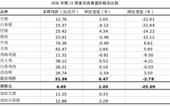 据市农信中心对我市各区县农贸市场10个主要肉禽蛋品种监测,第13周重庆市肉禽蛋均价31.96元,环比平稳,涨0.47%,同比小幅下跌2.78%。本周重庆猪肉市场持续整体偏弱运行。供应端,前期生猪产能偏高,规模场正常出栏,叠加前期压栏大猪集中释放,市场生猪供应充足,屠企收购顺畅。需求端,节后消费淡季,家庭腊肉库存未消化,餐饮、集团消费恢复缓慢,终端走货偏淡;禽肉等替代品分流,需求支撑不足。预计短期内,供需宽松格局不变,价格延续低位震荡、小幅偏弱运行。清明假期或带来小幅备货提振,但难改整体弱势,预计4月上旬仍以低位震荡为主,反弹乏力。本周生猪收购价、仔猪零售价分别上涨1.05%、4.34%,白条猪批发价、猪肉零售价分别下跌0.12%、2.48%,猪粮比4.09:1(低于盈亏平衡点6:1),环比稳中略涨1.05%,同比下降25.09%。