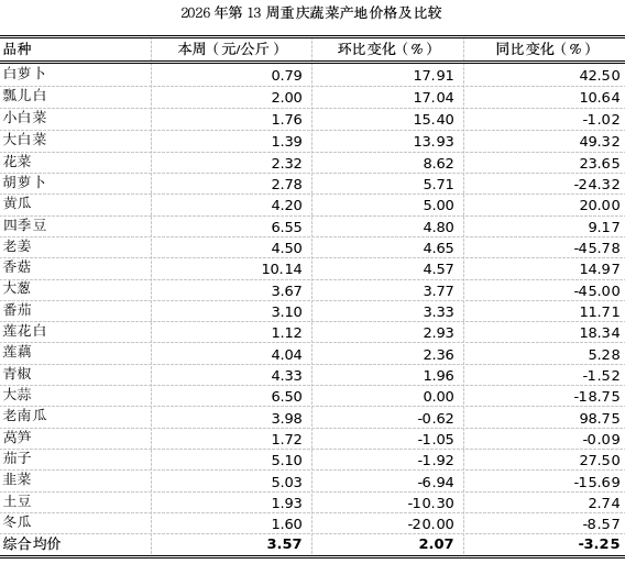 根据市农信中心对我市各区县农贸市场22个地产蔬菜监测品种监测,第13周重庆市蔬菜产地均价3.57元,环比略涨2.07%,14涨3跌5平稳,同比略跌3.25%。3月,本市地产蔬菜供应仍以青菜头、萝卜、莲白、大白菜等冬季菜为主,随着气温逐步回暖,春季蔬菜本地供应量增加。清明前夕,蔬菜市场需求趋于稳定,产地价格受采购商影响大,整体以平稳为主。其中,白萝卜、瓢儿白、小白菜、大白菜环比分别上涨17.91%、17.04%、15.40%、13.93%;冬瓜、土豆环比分别下跌20.00%、10.30%。