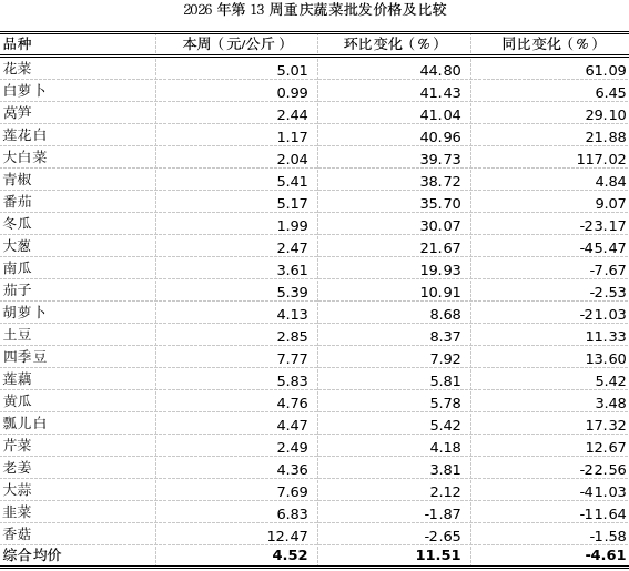 第13周重庆市双福国际农贸城蔬菜批发上市量(去粤菜)4.65万吨,环比略增2.68%;同比上浮1.82%、表现平稳。22个蔬菜监测品种批发均价4.52元,环比明显上涨11.51%,20涨2平稳;同比小幅下跌4.61%。本周南方地区多暴雨天气,影响蔬菜生产运输,批发价格呈上涨态势。其中,花菜、白萝卜、莴笋、莲花白环比分别大幅上涨44.80%、41.43%、41.04%、40.96%,大白菜、青椒、番茄、冬瓜环比分别明显上涨39.73%、38.72%、35.70%、30.07%,大葱、南瓜环比分别上涨21.67%、19.93%。其余蔬菜价格波动幅度较小。