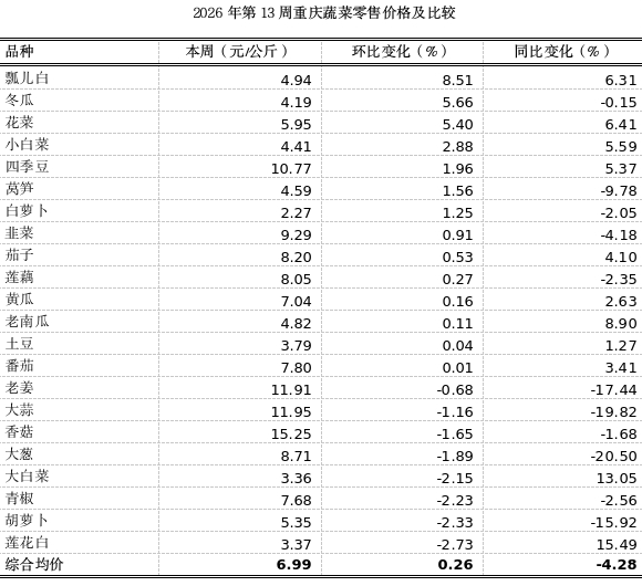 第13周重庆市各区县农贸市场22个蔬菜监测品种零售均价6.99元,环比上浮0.26%,表现平稳;同比小幅下跌4.28%。分品类看4涨4跌14平稳。其中,瓢儿白、冬瓜环比分别上涨8.51%、5.66%;莲花白下跌2.73%。其余蔬菜价格波动较小。