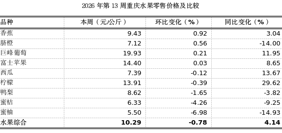 第13周我市各区县农贸市场9个大宗、时令水果监测品种总体零售均价10.29元,环比下滑0.78%、表现平稳,同比小幅上涨4.14%。供应端,3月本地脐橙、血橙、春见等中晚熟柑橘错峰上市,草莓、蓝莓、樱桃等春季水果大量涌入,枇杷、桃子开始成熟上市,水果市场供应充足、品种丰富。需求端,天气逐渐转暖,清明节气前夕,商铺备货和家庭消费基本稳定,市场价格波动呈平稳态势。其中,蜜桔、蜜柚即将下市,环比分别下跌6.98%、4.26%。其余品种价格基本平稳。