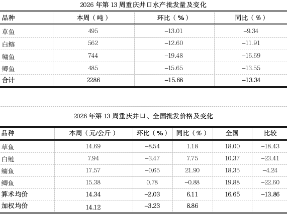 据市农业农村委监测,第13周重庆大宗水产产地均价15.39元,环比小幅下跌2.63%,同比上涨15.35%。名特优水产均价27.71元,环比上浮0.37%、表现平稳,同比下跌18.29%。进入早春时节,淡水鱼市场迎来越冬恢复与春繁准备的关键阶段,加之气温逐渐回升,鱼病发生率高,出鱼节奏受到影响,供应略微波动,近期消费需求无明显提升,市场价格整体小幅下行。小龙虾处于上市初期,消费热度较高,市场行情较好,持续处于上涨趋势。