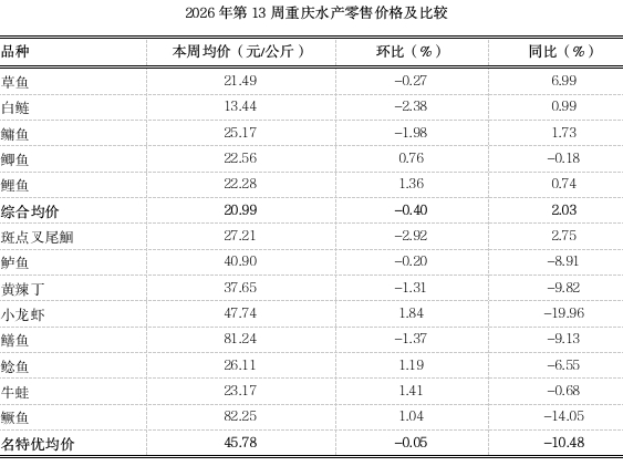 据市农业农村委监测,第13周重庆大宗水产零售均价20.99元,环比下滑0.40%、表现平稳,同比小幅上涨2.03%。名特优水产均价45.78元,环比下滑0.05%、表现平稳,同比下跌10.48%。