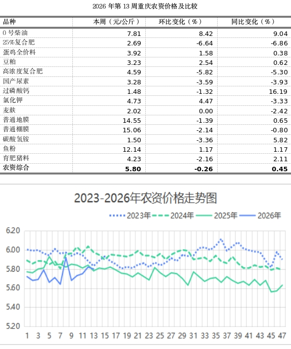 根据市农信中心对全市各区县农贸市场15种主要农资品种监测结果显示,第13周我市农资总体均价为5.80元,环比微幅下滑0.26%,总体表现平稳;与去年同期相比小幅上浮0.45%,呈现止跌回稳态势。当前正值人勤春早时节,春节过后各地春耕备耕工作陆续展开,农资市场供应总体充足。气象预报显示,下周我市天气以多云间晴为主,有助于田间病虫害防治工作的开展;中心城区气温预计在12至28摄氏度,较前期有所回升。从具体品类看,本周化肥价格普遍下跌,其中25%复合肥、高浓度复合肥、国产尿素、过磷酸钙、碳酸氢铵价格分别下跌6.64%、5.82%、3.39%、1.32%、3.36%;氯化钾价格上涨4.47%。农膜方面,普通地膜、普通棚膜价格分别回落1.39%、2.14%。饲料价格整体略有上涨,豆粕和鱼粉价格分别上涨2.24%和1.17%;育肥猪饲料价格下跌2.16%,麦麸价格保持稳定;蛋鸡全价料价格小幅上涨1.58%。0号柴油价格延续涨势,本周明显上涨8.42%。