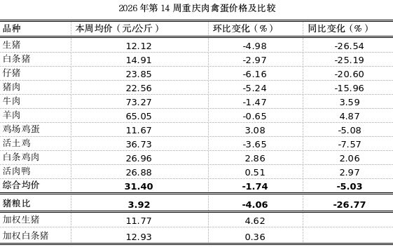 据市农信中心对我市各区县农贸市场10个主要肉禽蛋品种监测,第14周肉禽蛋均价为31.40元,环比稳中略跌1.74%,同比明显下跌5.03%。本周重庆猪肉市场价格持续低位运行,供强需弱格局明显。供应端,前期能繁母猪存栏偏高,当前适重标猪集中出栏,规模场出栏计划增加,叠加部分养殖户资金紧张被动出栏,形成市场猪源充裕。需求端,处于消费淡季、加之清明节习俗影响,致使餐饮、家庭消费猪肉双端疲软。禽肉、牛羊肉等替代品充足,分流部分猪肉需求,终端走货缓慢。预计短期内(4月中下旬),猪肉价格仍将低位震荡,供应端过剩压力暂难缓解,需求端难有明显提振。本周生猪收购价、白条猪批发价、仔猪零售价、猪肉零售价分别下跌4.98%、2.97%、6.16%、5.24%,猪粮比3.92:1(低于盈亏平衡点6:1),环比下跌4.06%,同比陡降26.77%。