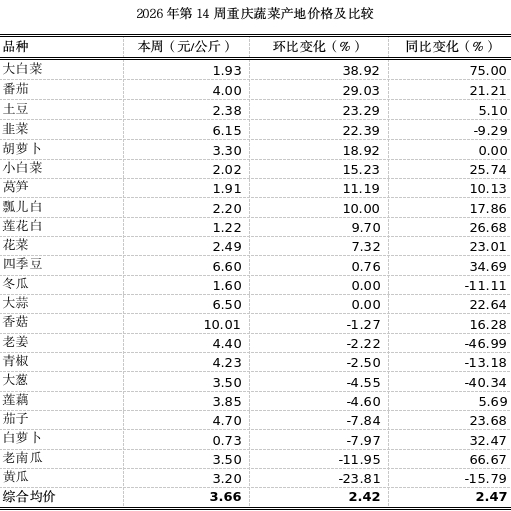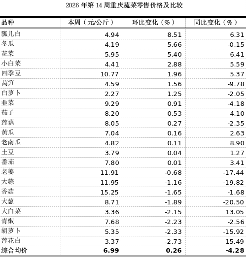 第14周重庆市各区县农贸市场22个蔬菜监测品种零售均价6.99元,环比上浮0.26%,表现平稳;同比小幅下跌4.28%。分品类看4涨4跌14平稳。本周蔬菜消费市场持续稳定,零售价格总体平稳。其中,瓢儿白、冬瓜环比分别上涨8.51%、5.66%;莲花白、胡萝卜环比分别下跌2.73%、2.33%。其余蔬菜价格波动较小。