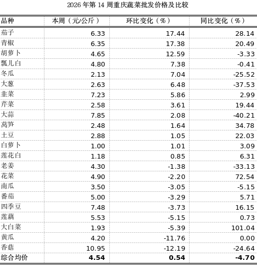 据市农信中心对重庆双福国际农贸城22个蔬菜监测品种监测显示,第14周批发均价4.54元。环比上浮0.54%,表现平稳,9涨8跌5平稳;同比小幅下跌4.70%。适逢春淡,冬季蔬菜处于上市晚期,加之全国油价上涨,运输成本增加,南方部分省市遭遇暴雨,推高了生产成本,综合导致部分蔬菜批发价格上涨,其中茄子、青椒、胡萝卜环比分别上涨17.44%、17.38%、12.59%。其余蔬菜价格波动幅度较小。