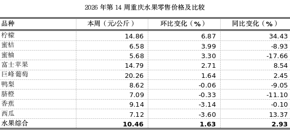 第14周我市各区县农贸市场9个大宗、时令水果监测品种总体零售均价10.46元,环比上浮1.63%、表现平稳,同比略涨2.93%。供应端,3月本地脐橙、血橙、春见等中晚熟柑橘处于上市尾期,草莓、蓝莓、樱桃等春季水果开始涌入,水果市场供应充足、品种丰富。需求端,气温攀升迅速,适逢清明节假日,商铺备货和家庭消费量增加,市场价格波动呈平稳态势。其中,柠檬环比上涨6.87%,蜜桔、蜜柚环比分别略涨3.99%、3.30%;西瓜、香蕉环比分别略跌3.60%、3.14%。其余品种价格基本平稳。