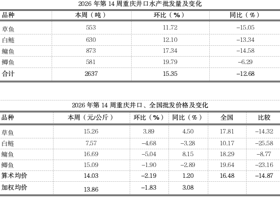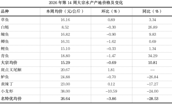 据市农业农村委监测,第14周大宗水产产地均价15.29元,环比下滑0.69%、表现平稳,同比上涨10.81%。名特优水产均价26.64元,环比下跌3.86%,同比下跌28.53%。进入早春时节,淡水鱼市场迎来越冬恢复与春繁准备的关键阶段,加之气温逐渐回升,鱼病发生率高,出鱼节奏受到影响,清明假期消费拉动较弱,市场需求无明显提升,价格整体平稳波动。近期小龙虾逐渐大量上市,货源供应增加,市场价格小幅回落。