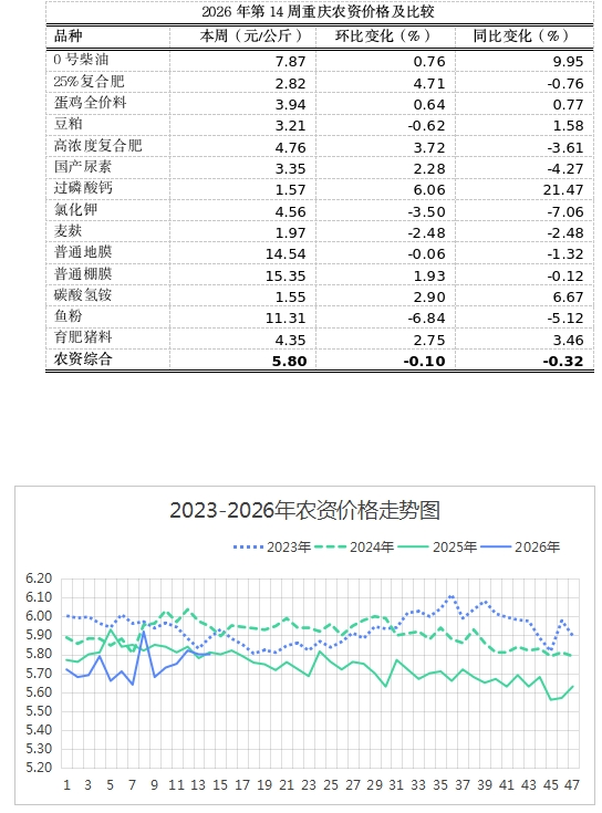 据市农信中心对我市各区县农贸市场14种主要农资价格监测结果显示,第14周农资总体均价为5.80元,市场总体表现平稳。从具体品类看,春耕春播进入白热化阶段,农资需求量增加,带动化肥价格回升,其中25%含量复合肥、高浓度复合肥、国产尿素、过磷酸钙以及碳酸氢铵的价格分别回升4.71%、3.72%、2.28%、6.06%和2.92%;农膜方面,普通棚膜价格上涨1.95%。饲料价格整体呈现有涨有跌,育肥猪饲料上涨2.75%、麦麸和鱼粉分别下跌2.48%和6.84%、豆粕下跌0.62%。此外,受国际原油上涨影响,0号柴油价格延续五周涨势,本周上浮0.76%,致使蛋鸡全价料上浮0.64%。