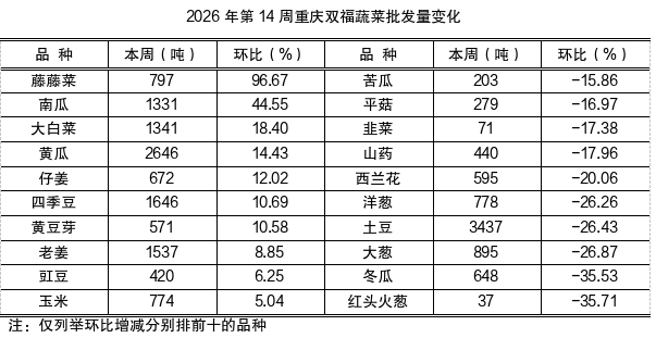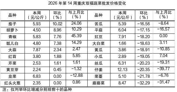 第14周蔬菜批发价格环比30跌7涨4平稳,总体算术批发均价4.86元(为公斤价,以下同),环比明显下跌10.99%,同比明显下跌15.92%。总体加权批发均价4.35元,环比小幅下跌4.82%,同比下跌9.67%。具体表现,环比跌幅较大的品种及价格变化:藤藤菜8.47元,环比骤降32.29%;菜薹5.10元、仔姜12.13元、丝瓜6.31元,环比分别大幅下跌21.78%、20.35%、20.23%;小瓜、黄瓜、大白菜、豇豆、平菇、苦瓜、红小米辣、番茄、花菜、玉米、莲花白、香菇、白萝卜、南瓜、莴笋,环比分别明显下跌19.05%、18.91%、18.63%、18.20%、17.15%、16.56%、16.47%、14.70%、13.37%、12.70%、11.97%、11.39%、11.11%、10.53%、10.25%。环比涨幅较大的品种及价格变化:茄子,环比明显上涨10.02%。(增减幅前十位品种见下表)
