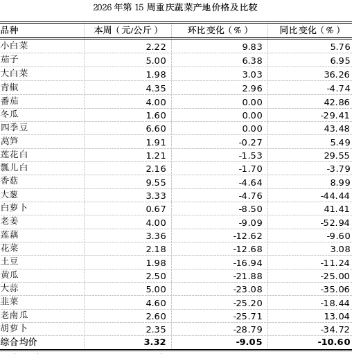 据市农信中心第15周对我市各区县农贸市场22个地产蔬菜监测显示:蔬菜产地均价为3.32元,环比下跌9.05%,4涨12跌6平稳;同比明显下跌10.06%。本周天气炎热,本地地产蔬菜加速生长,以藤菜、莴笋等速生菜和茄果、瓜果、豆类设施蔬菜为主,整体量增价跌。其中,胡萝卜、老南瓜、韭菜、大蒜、黄瓜、土豆环比分别下跌28.79%、25.71%、25.20%、23.08%、21.88%、16.94%;小白菜环比下跌9.83%。其余蔬菜价格波动幅度较小。