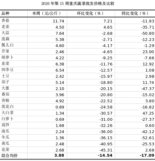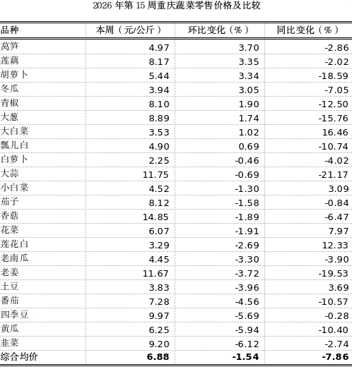 据市农信中心第15周对重庆双福国际农贸城22个蔬菜监测显示:蔬菜批发均价为3.88元,环比明显下跌14.54%,20跌2涨;同比明显下跌17.09%。其中,香菇环比上涨7.21%;花菜、黄瓜、冬瓜、南瓜、莴笋、白萝卜环比分别下跌45.31%、40.95%、36.15%、36.00%、32.26%、31.00%。其余蔬菜价格波动幅度较小。