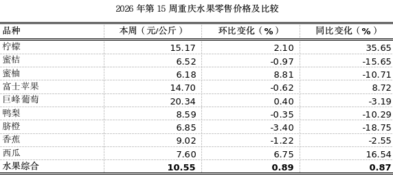 据市农信中心第15周对我市各区县农贸市场9个大宗、时令水果监测显示:水果总体零售均价为10.55元,环比上浮0.89%,呈现4涨5跌态势;同比上浮0.87%,表现平稳。供应端方面,本地脐橙、血橙等中晚熟柑橘处于上市尾期,市外草莓、蓝莓、樱桃等水果大量涌入,水果市场供应充足、品种丰富。需求端方面,本周气温攀升快,西瓜等水分充足水果消费量增加,市场价格波动呈平稳态势。其中,柠檬环比略涨2.10%,蜜柚、西瓜环比分别上涨8.81%、6.75%;脐橙环比略跌3.40%。其余品种价格整体比较平稳。
