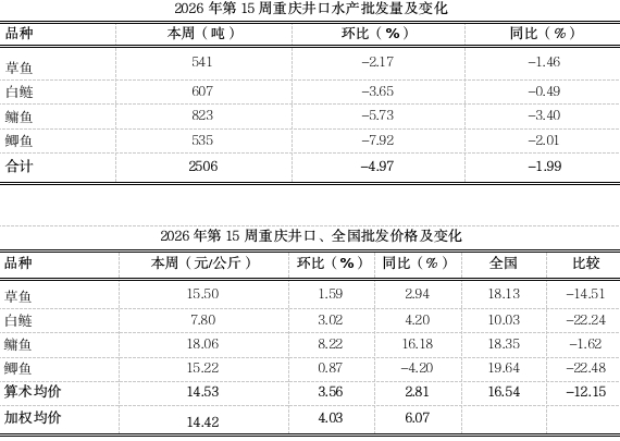 据市农业农村委监测显示:第15周重庆大宗水产产地均价为15.11元,环比下滑0.27%、表现平稳,同比上涨12.91%;名特优水产均价为27.85元,环比上涨4.55%,同比下跌6.29%。近期气温逐渐升高,常见鱼病发生率增加,出鱼节奏受到影响,加之运输储存成本增加,但近期市场需求无明显提振,供需处于平衡阶段,市场价格整体平稳运行。