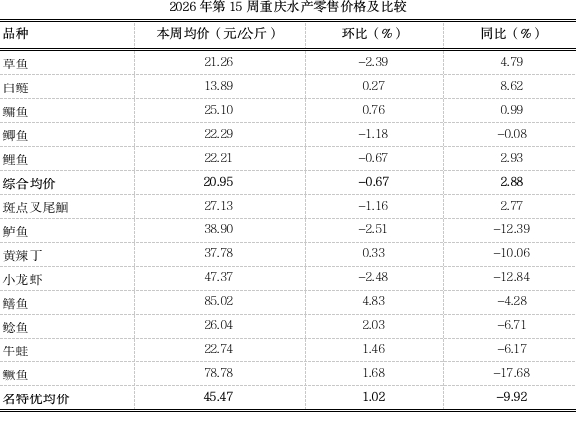 据市农业农村委监测显示:第15周重庆大宗水产零售均价为20.95元,环比下滑0.67%、表现平稳,同比小幅上涨2.88%;名特优水产均价为45.47元,环比稳中略涨1.02%,同比下跌9.92%。