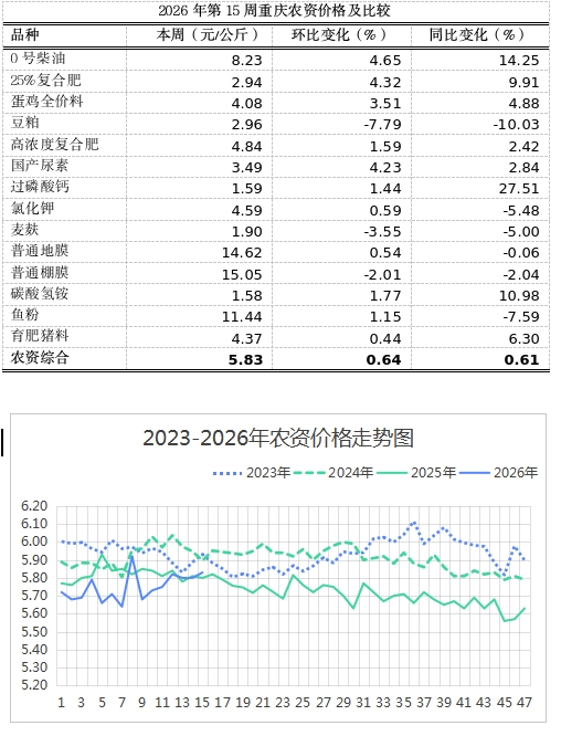 市农信息中心第15周对全市各区县农贸市场14种主要农资价格监测显示:我市农资总体均价为5.83元,环比上浮0.64%,市场总体表现平稳。从具体品类看,本周化肥价格回升,其中25%复合肥、高浓度复合肥、国产尿素、过磷酸钙以及碳酸氢铵的价格分别上涨4.32%、1.59%、4.23%、1.44%和1.77%;普通棚膜价格下跌2.01%;饲料价格整体略有下跌,豆粕和麦麸价格分别下跌7.79%和3.55%;鱼粉价格上涨1.15%,育肥猪料价格上浮0.44%;蛋鸡全价料价格保持上涨趋势,上涨3.51%。此外,0号柴油价格延续六周涨势,本周上涨4.65%,受国际油价及运输成本影响显著。