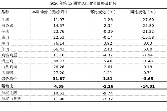 据市农信中心第15周对我市各区县农贸市场10个主要肉禽蛋品种监测显示:肉禽蛋均价为31.87元,环比稳中略涨1.51%;同比下跌3.65%。本周重庆猪肉市场价格持续低位运行,供强需弱格局持续。供应端方面,前期能繁母猪存栏偏高,当前适重标猪集中出栏,规模场加快出栏节奏,叠加部分养殖户资金紧张被动出栏,市场猪源大幅过剩。本地及外省调入生猪持续增加,屠宰端收购充足,压价意愿强,推动批发、零售价同步走低。需求端方面,处于猪肉消费传统淡季,叠加清明后餐饮、家庭消费疲软,禽肉、牛羊肉等替代品供应充足,分流大量需求,终端走货缓慢,市场购销冷清。预计短期内(4月中下旬),猪肉价格仍将低位震荡偏弱,无明显上涨动力。供应端过剩压力暂难缓解,适重猪源充足出栏,需求端难有明显提振,消费淡季延续。本周生猪收购价、白条猪批发价、仔猪零售价、猪肉零售价分别下跌1.26%、2.34%、0.39%、0.14%,粮比4.59:1(低于盈亏平衡点6:1),环比稳中略跌1.26%,同比大幅下降14.84%。