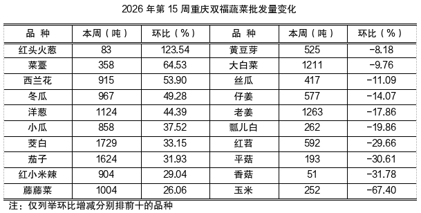 第15周蔬菜批发价格环比33跌7涨1平稳,总体算术批发均价4.45元(为公斤价,以下同),环比下跌9.00%,同比大幅下跌23.67%。总体加权批发均价3.85元,环比明显下跌11.76%,同比大幅下跌20.01%。具体表现,环比跌幅较大的品种及价格变化:花菜2.73元、黄瓜2.46元、小瓜1.87元、茭白3.80元、南瓜2.24元,环比分别骤降37.10%、36.27%、35.29%、33.80%、30.65%;冬瓜1.34元、豇豆6.01元、莴笋1.70元、白萝卜0.70元,环比分别大幅下跌28.72%、24.02%、22.37%、20.45%;大白菜、青椒、茄子、莲花白、仔姜、西兰花、土豆、番茄、丝瓜、四季豆,环比分别明显下跌19.88%、15.95%、15.51%、13.59%、13.31%、12.09%、12.09%、11.79%、11.73%、10.33%。环比涨幅较大的品种及价格变化:平菇7.41元、红头火葱2.82元,环比分别大幅上涨22.68%、20.00%;蒜薹,环比明显上涨11.06%。(增减幅前十位品种见下表)