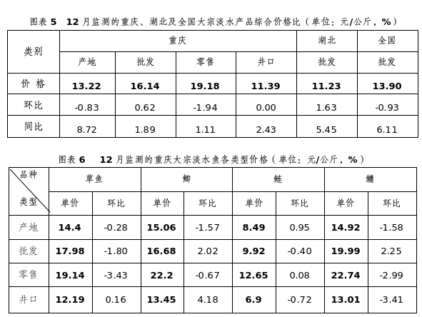 12月监测的大宗淡水产品各类型价格环比小幅波动,同比不同程度上涨。重庆井口市场大宗淡水产品批发综合均价11.39元/公斤,较湖北均价高1.43%,比全国均价低18.06%。12月由于商品鱼大量集中上市,市场供应充足,其产地价格处于低位,加上气温下降,活鱼运输成本较低,因此本月大宗淡水鱼各类型价格环比小幅波动,但产地价格同比出现不同程度上涨。