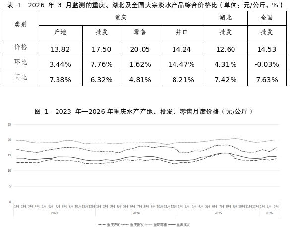 3月全市水产品价格受“春缺”效应推动,各环节均呈上涨态势,产地、批发涨幅明显,零售温和跟涨。产地均价13.82元/公斤,环比上涨3.44%,同比上涨7.38%,为近四年同期最高,由于春缺期存塘鱼减少、新鱼未上市,同时普通饲料低位运行,养殖户挺价意愿较强。批发均价17.50元/公斤,环比上涨7.76%,同比上涨6.32%,批发价涨幅领先于产地,由于流通环节对春缺效应更为敏感,批发商加价空间扩大。零售均价20.05元/公斤,环比上涨1.62%,同比上涨4.81%,零售价涨幅温和,批零价差由2月的3.49元扩大至3.55元,流通环节利润空间进一步改善,终端消费承受力有所提升。