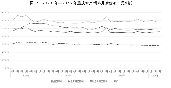 3月水产饲料价格总体平稳,品种间分化持续。三种主要鱼饲料综合均价9152.5元/吨,环比上涨0.58%,同比下跌10.45%。鲈鱼专用饲料均价11858.33元/吨,环比上涨0.99%,同比下跌8.65%,尽管同比降幅明显,但绝对价格仍处于高位,鲈鱼养殖成本不断攀升。黄颡鱼专用饲料均价9853.33元/吨,环比微跌0.05%,同比下跌2.22%,成本相对可控。普通鱼饲料均价5745.83元/吨,环比微涨0.83%,同比下跌0.86%,仍处于近三年低位,由于玉米、豆粕原料价格企稳,饲料企业竞争激烈,大宗鱼养殖成本持续处于有利区间。从成本传导来看,饲料成本持续下降而产地价格上涨,形成了“成本降、价格升”的利好趋势,对于鲈鱼等名特优品种,饲料成本仍处于高位,但鱼价同步上涨,养殖效益总体稳定。普通大宗鱼饲料成本降幅大于价格涨幅,效益提升较为明显。